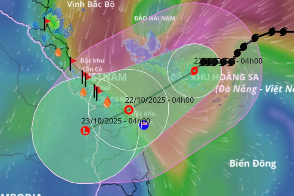 Theo dự báo, khoảng 4h ngày 23/10, bão suy yếu thành áp thấp nhiệt đới trên khu vực vùng ven biển từ Huế đến Quảng Ngãi. Thời điểm này, vùng biển phía Tây khu vực Bắc Biển Đông (bao gồm đặc khu Hoàng Sa), vùng biển từ Quảng Trị đến Quảng Ngãi (bao gồm đặc khu Cồn Cỏ, đảo Cù Lao Chàm và đặc khu Lý Sơn) đều bị ảnh hưởng.